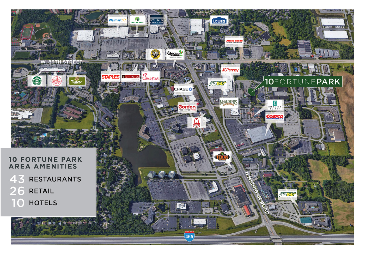 10 Fortune Park is surrounded by multiple retail, hotel and restaurant amenities. Within Fortune Park Business Center there is a full-service Embassy Suites Hotel and numerous casual dining options. The park provides access to two major thoroughfares, U.S. 421 (Michigan Road) and West 86th Street.